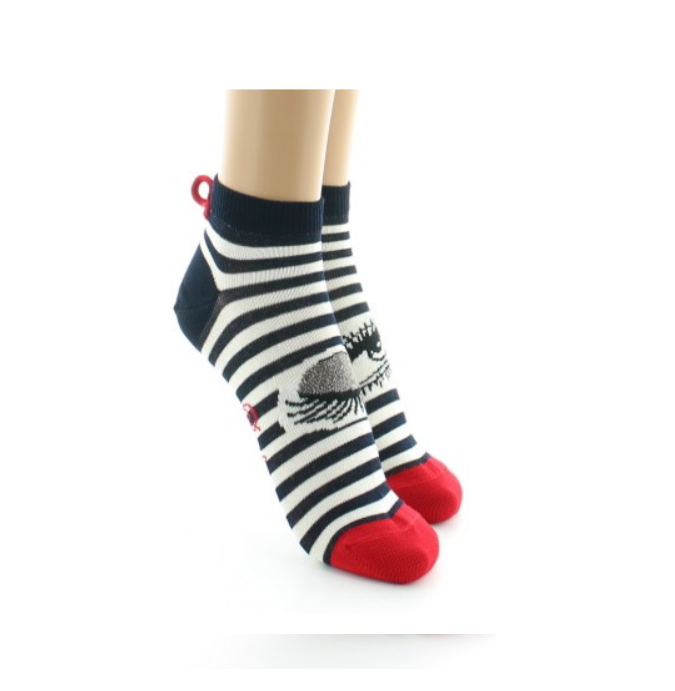 Prenez-garde au charme redoutable de cette Berthe dû à ce clin d'œil ravageur : un œil fermé sur un pied, un deuxième ouvert sur l'autre… L'esprit "marinière" est présent grâce à ces rayures marines et blanches. Le fil d'Ecosse utilisé confère à ces chaussettes confort et finesse. Le modèle destiné à la gente féminine se différencie par des paupières en lurex brillant.